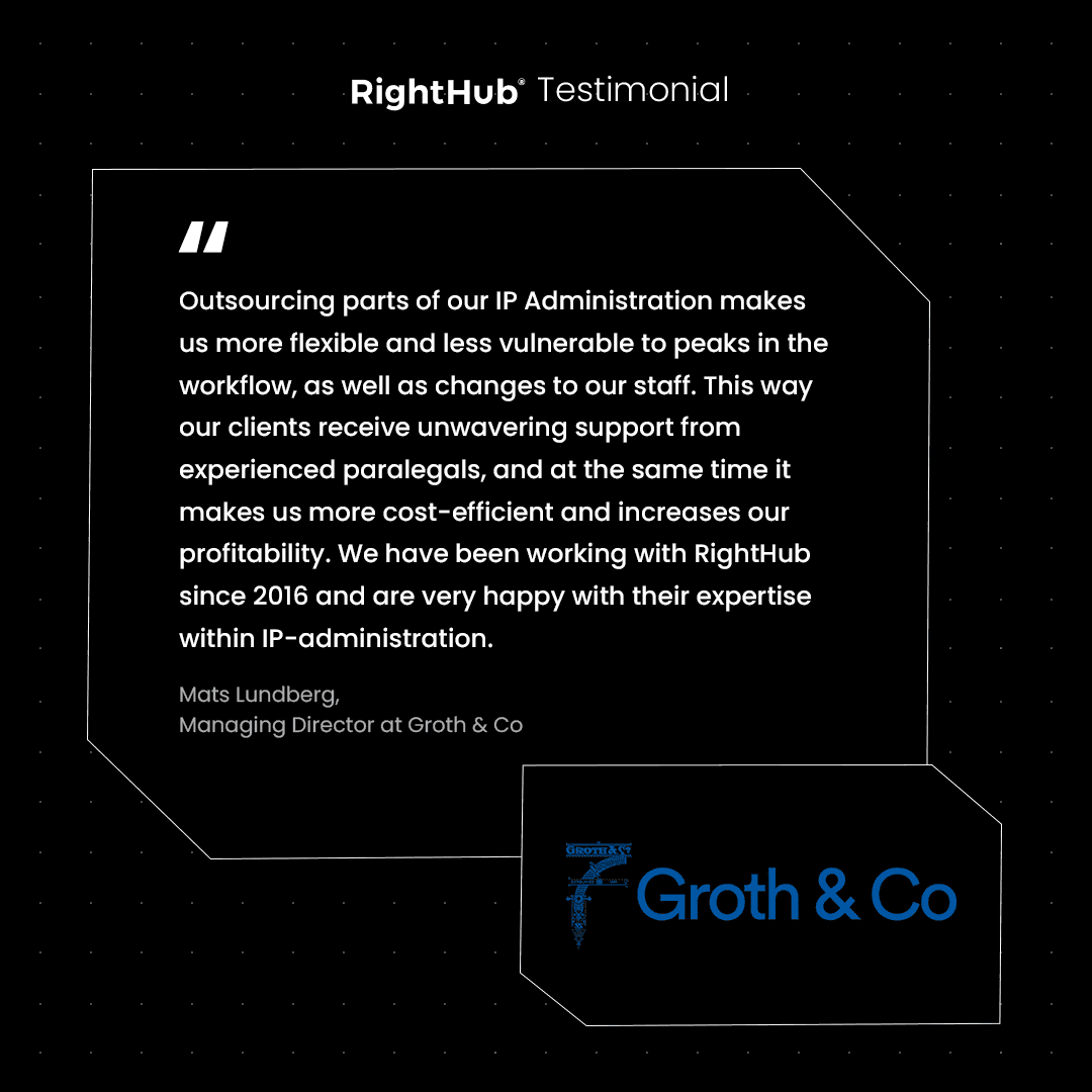 We provide many different services for Groth & Co. In some areas we have taken full responsibility over a department, whereas some other services are provided based on the present need of our client. We for example handle all of Groth’s EP Validations in Sweden, where RightHub has taken full responsibility for everything from receiving and docketing new orders, to sending the final filing report and invoice.